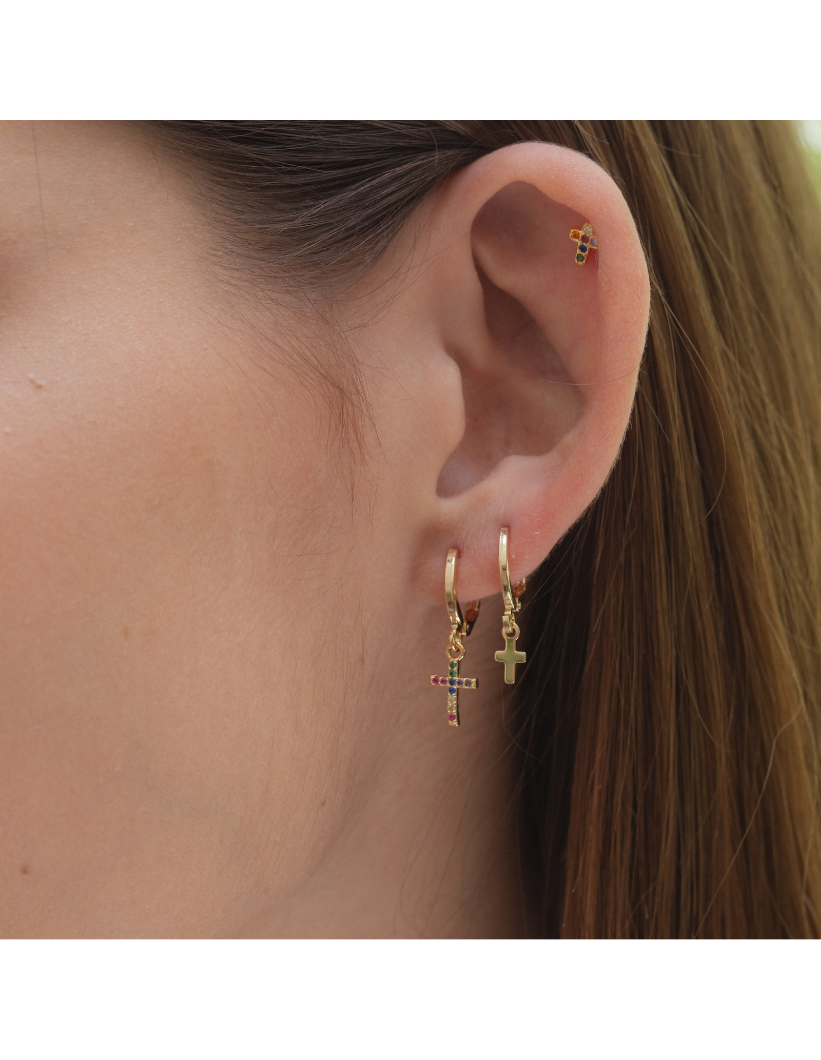 Mini cross earrings in 925 silver with zirconias. Screw closure, the most comfortable, ideal for the first, second or third holes. Also as a piercing for the lobe, tragus or helix.
