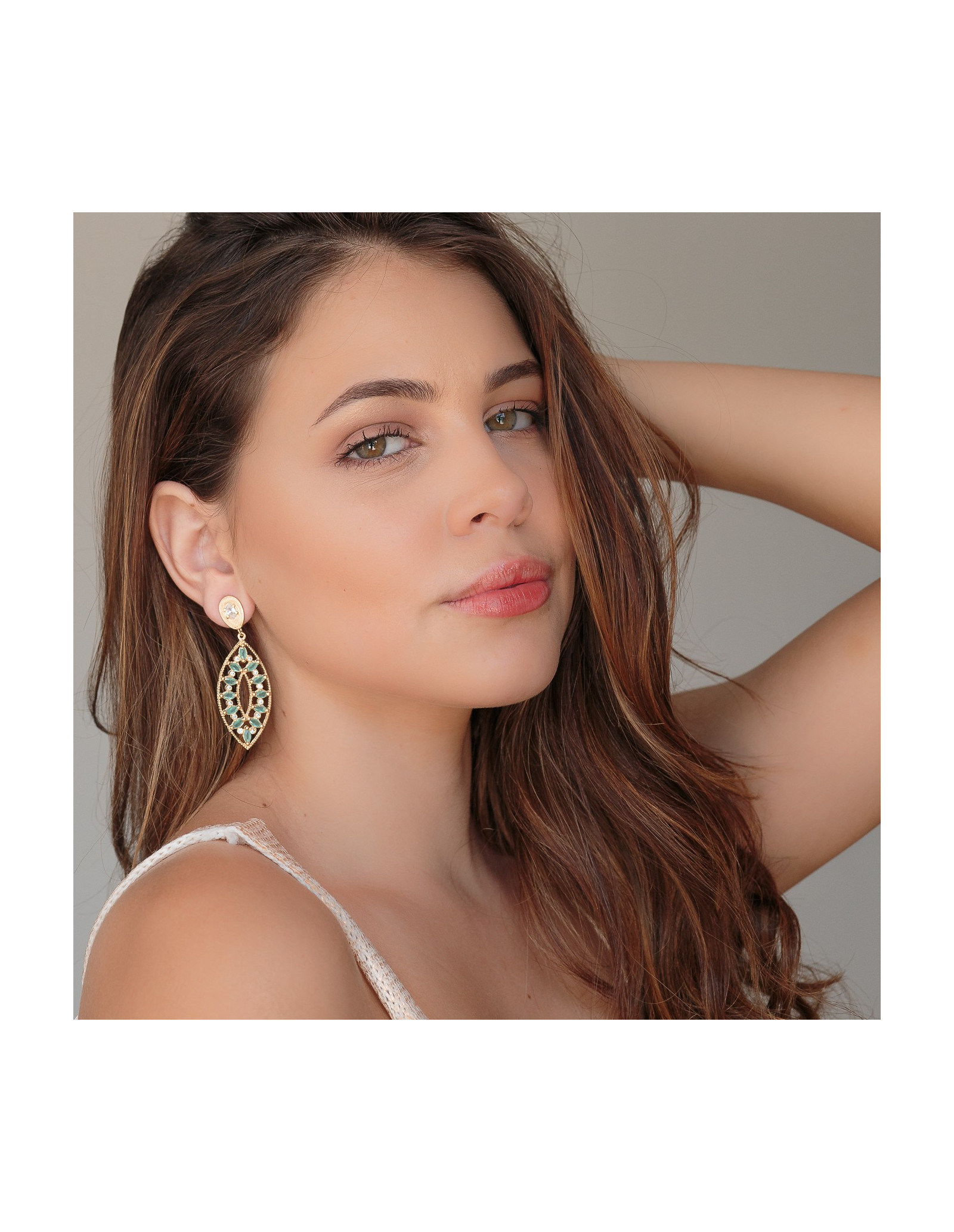 Long earrings in marquise format with aquamarine crystals and inlaid zirconias.