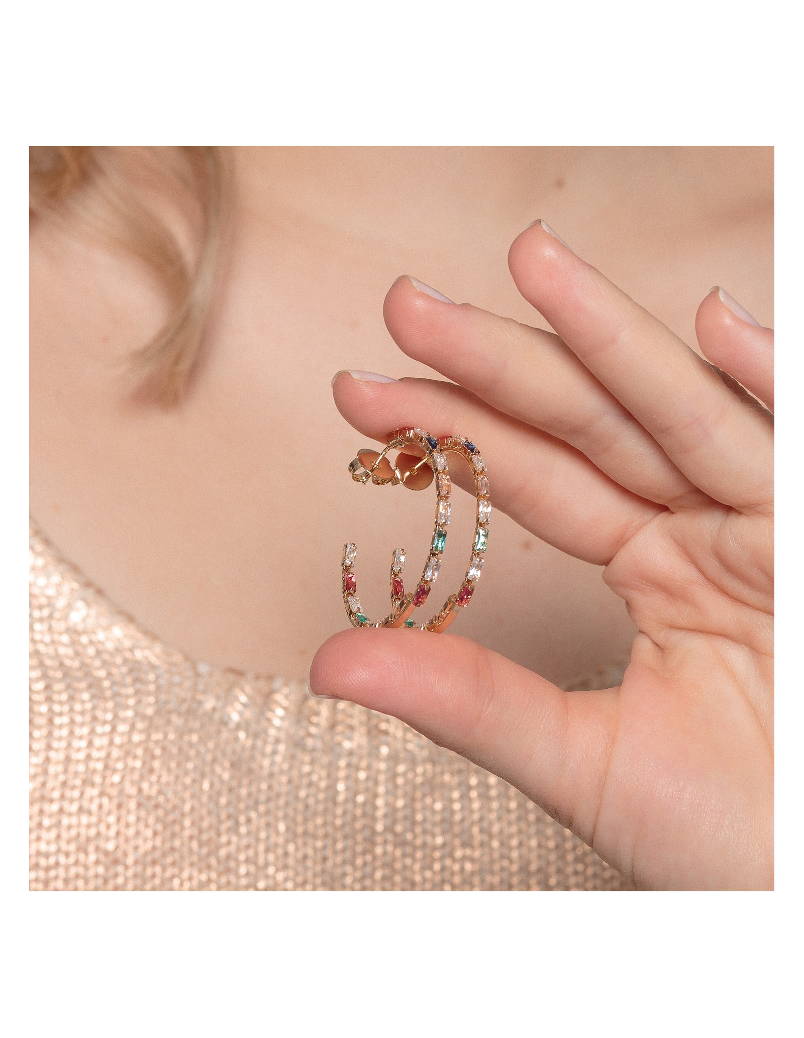 Open hoop earrings with multicolored crystals.
