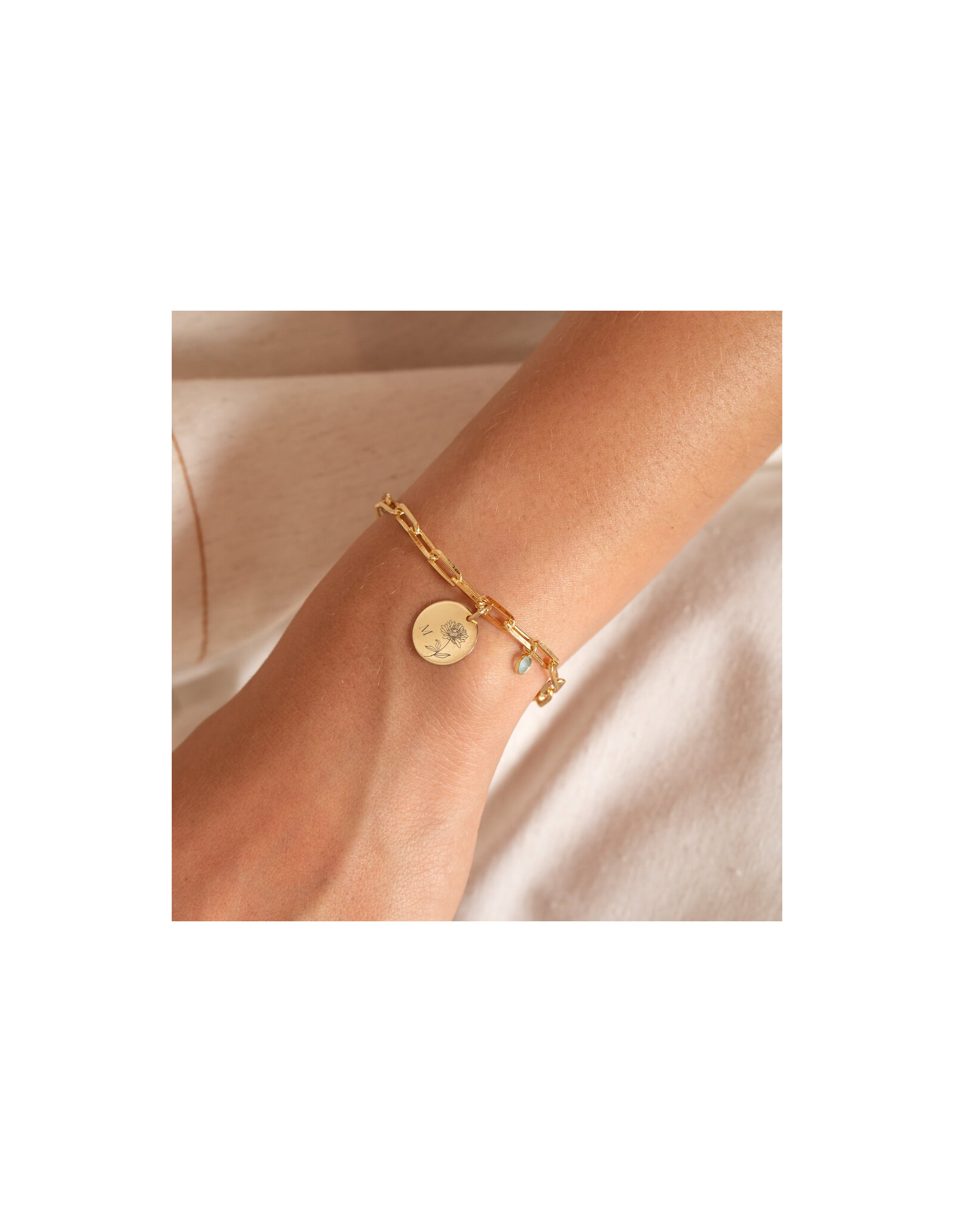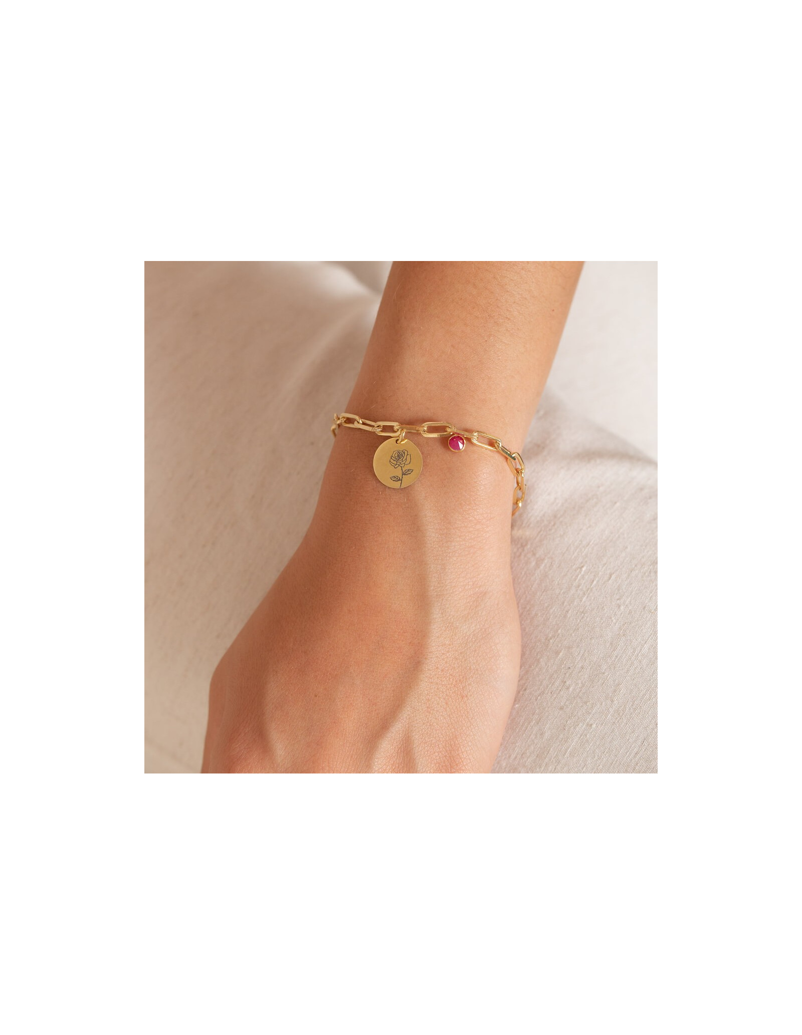Chain bracelet with a mineral and a plaque with a birth flower engraving.