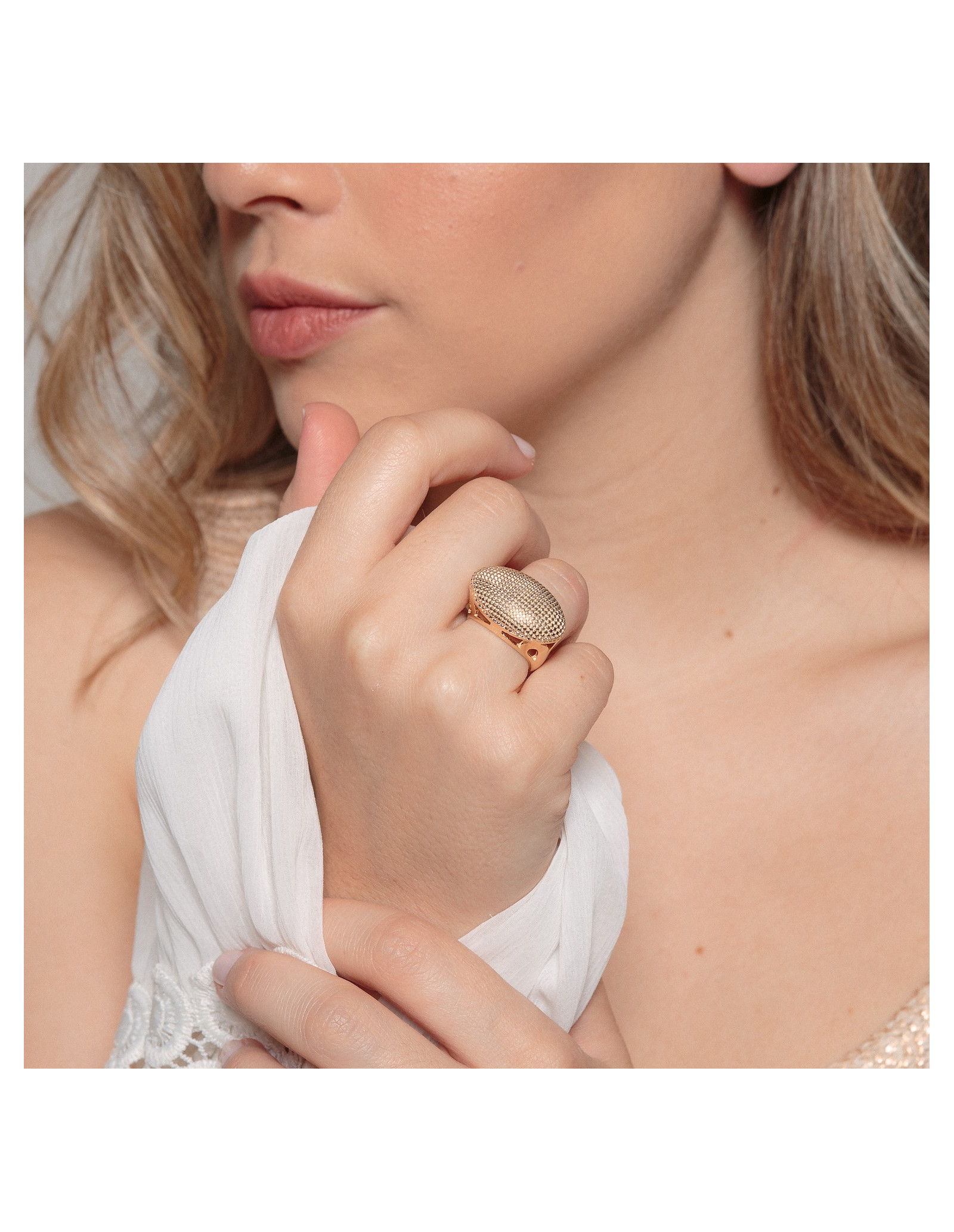 Oval shaped ring with dotted texture, mounted on sculpture base.