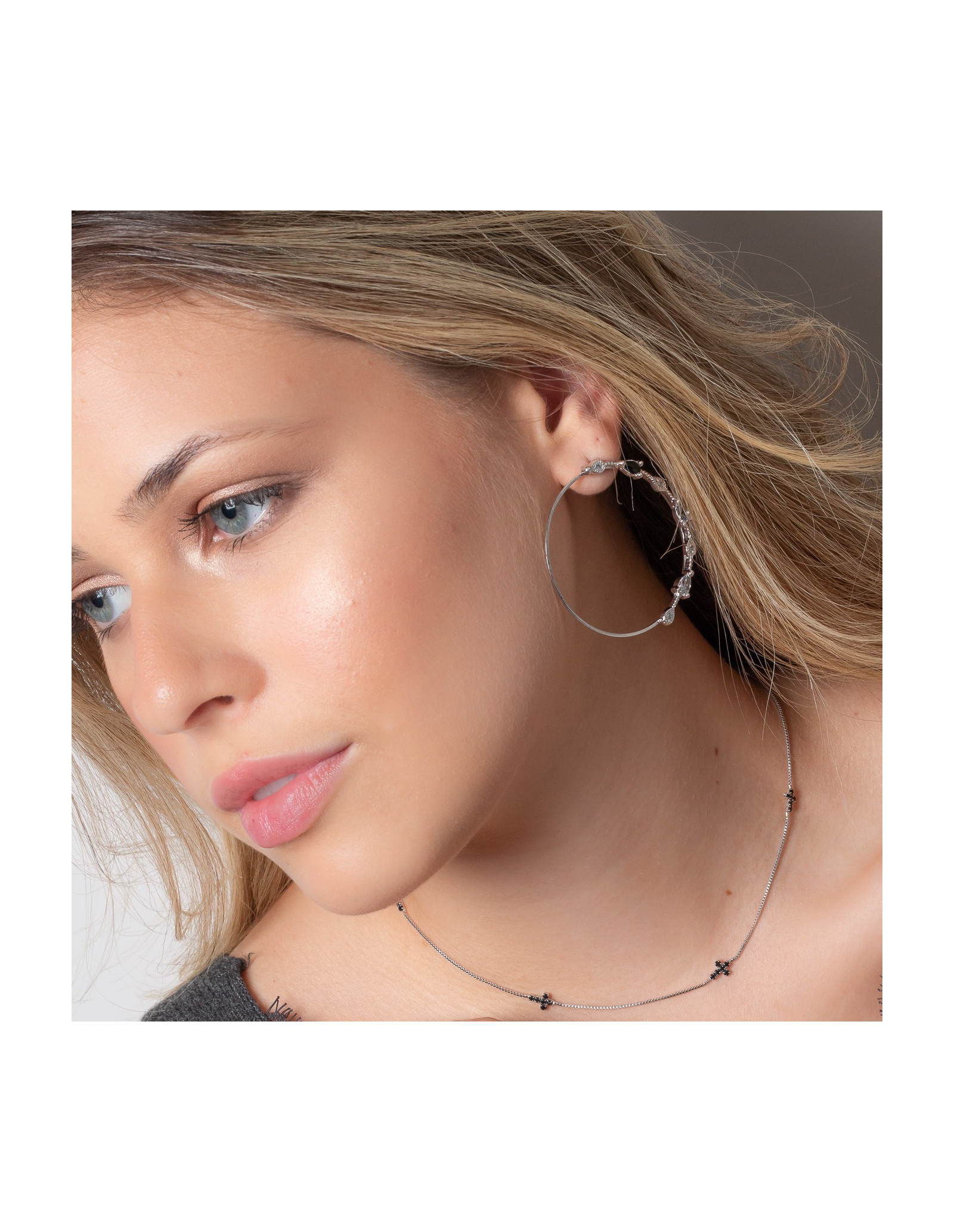 Circle earrings decorated with three black and gray crystals and four zircons.