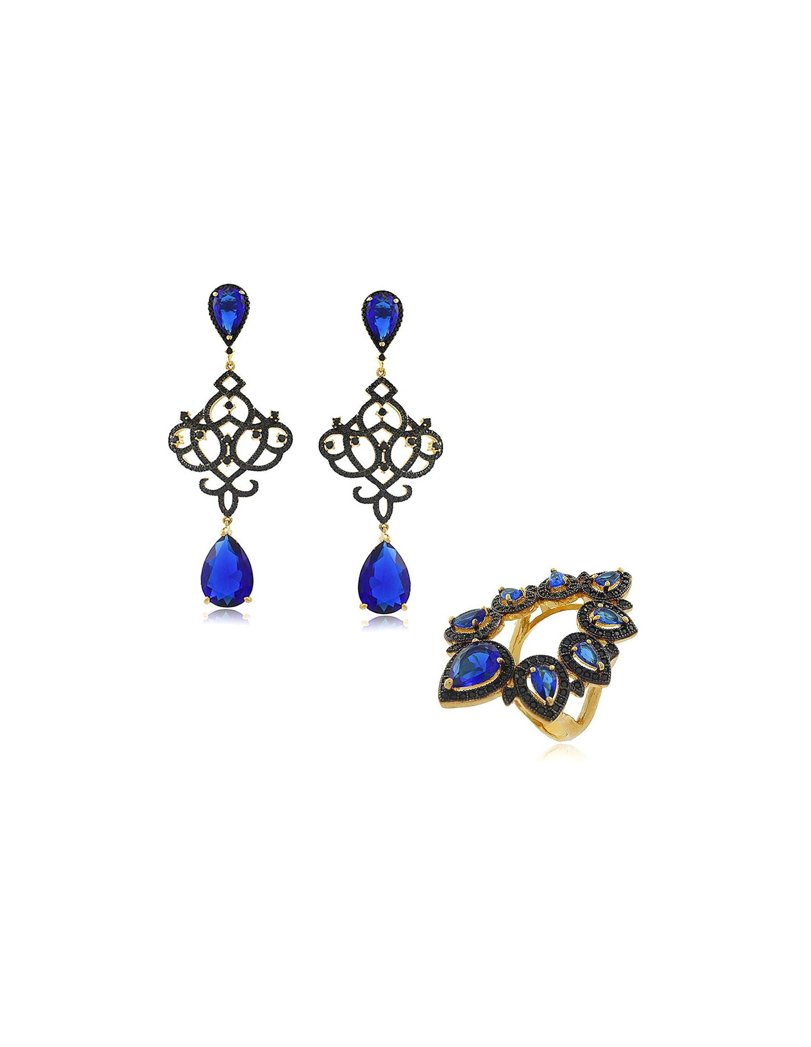 Anillo decorado con cristales azules en forma de gota y microzirconia negra incrustada.
