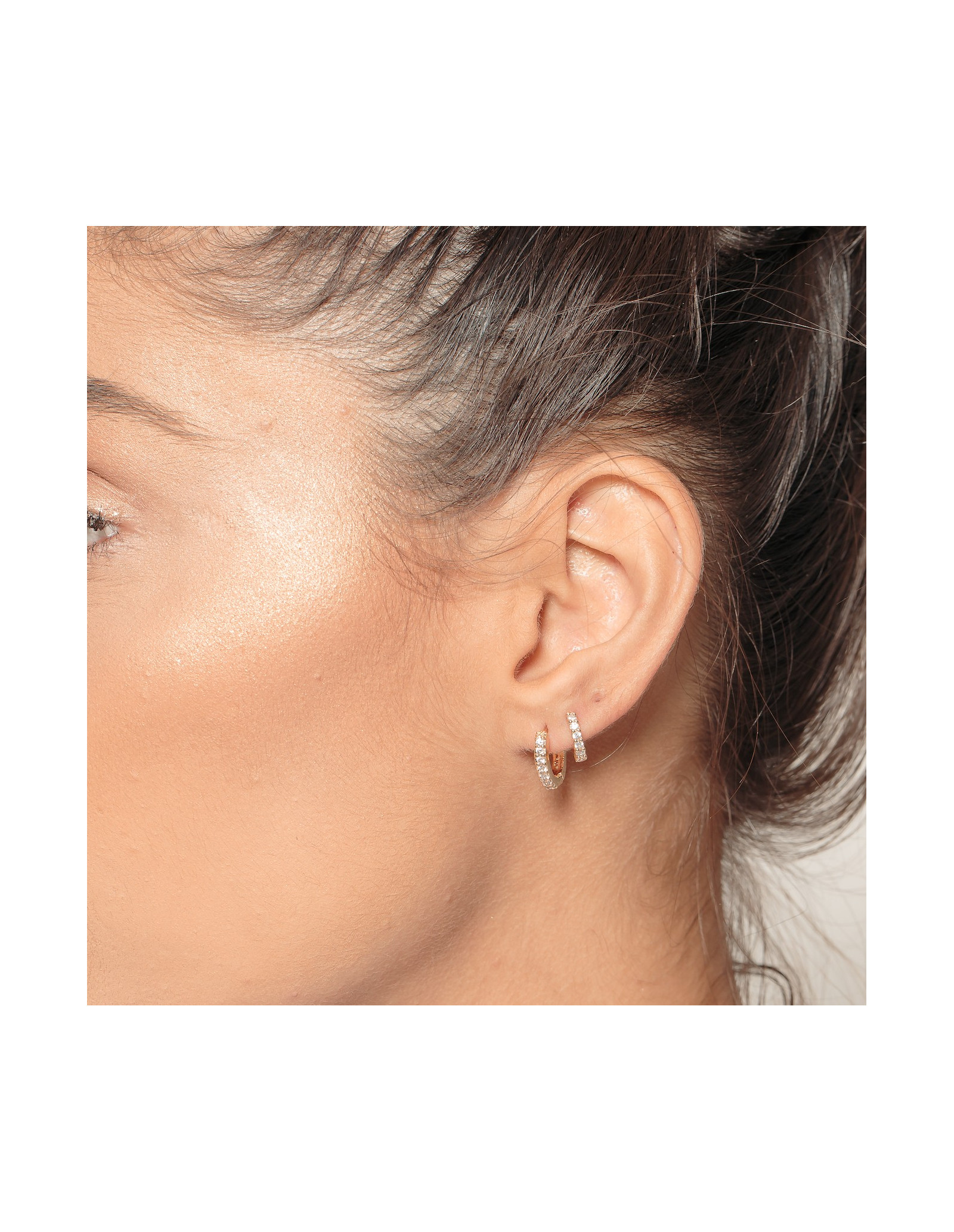 Pack de tres pendientes de aro mini decorados con circonitas blancas incrustadas. Para el primer, segundo y tercer agujeros o como piercing de hélix.