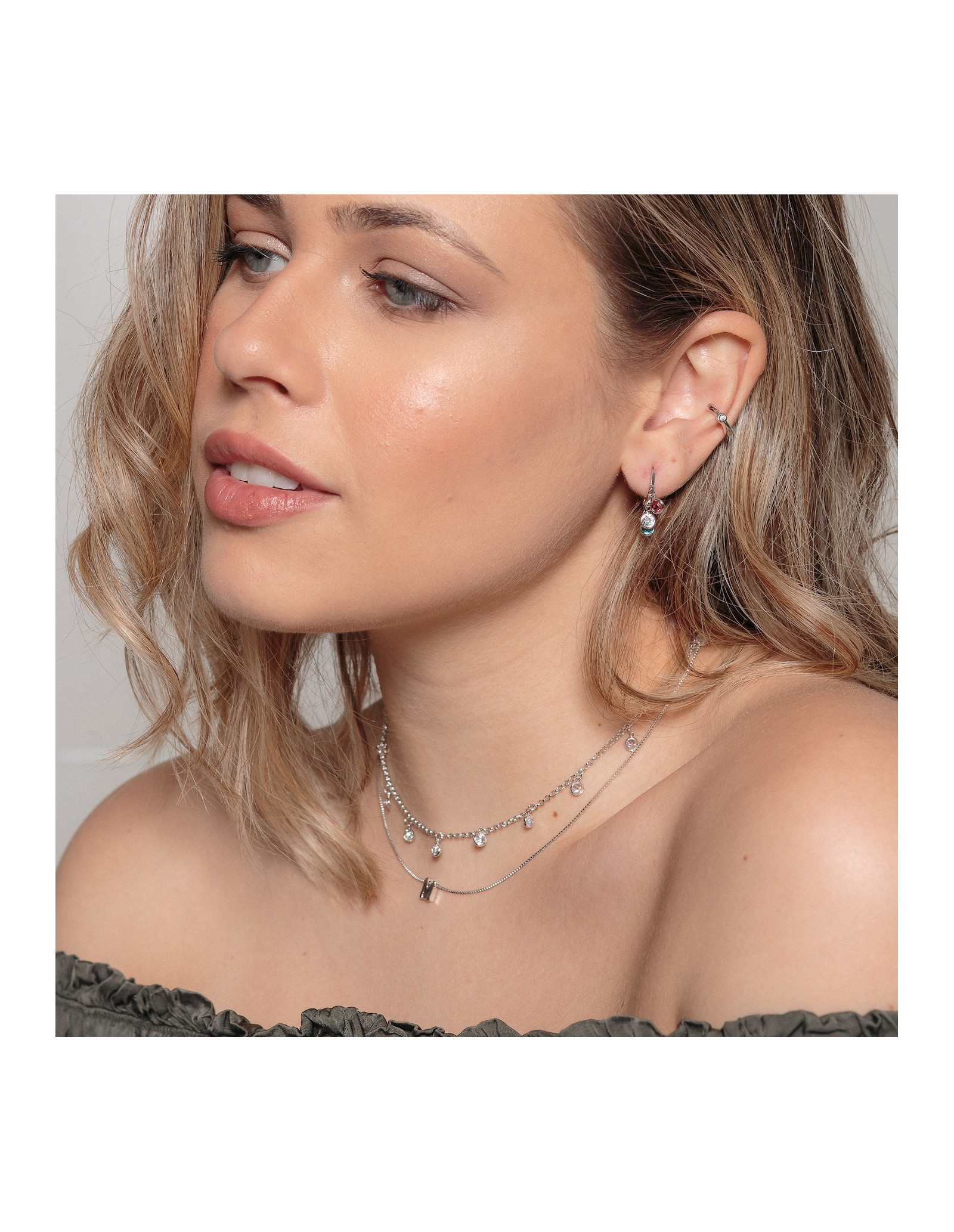 Pendientes tipo aro cerrado en oro blanco, con 3 circonitas colgadas: azul, rosa y transparente.