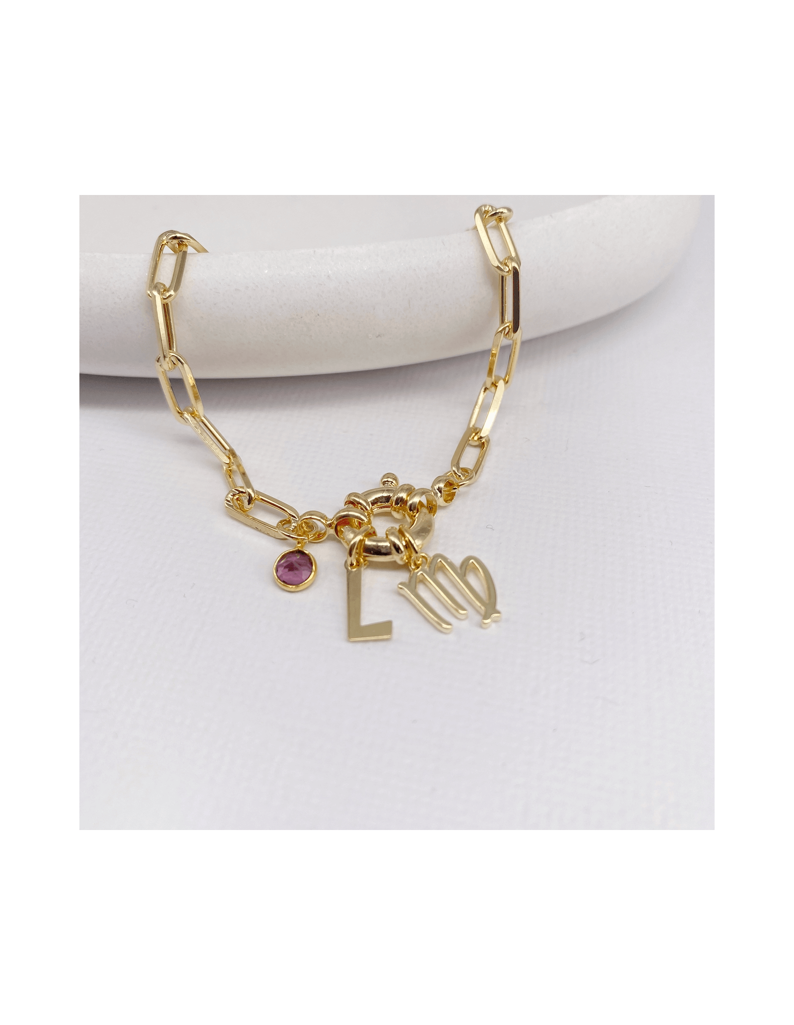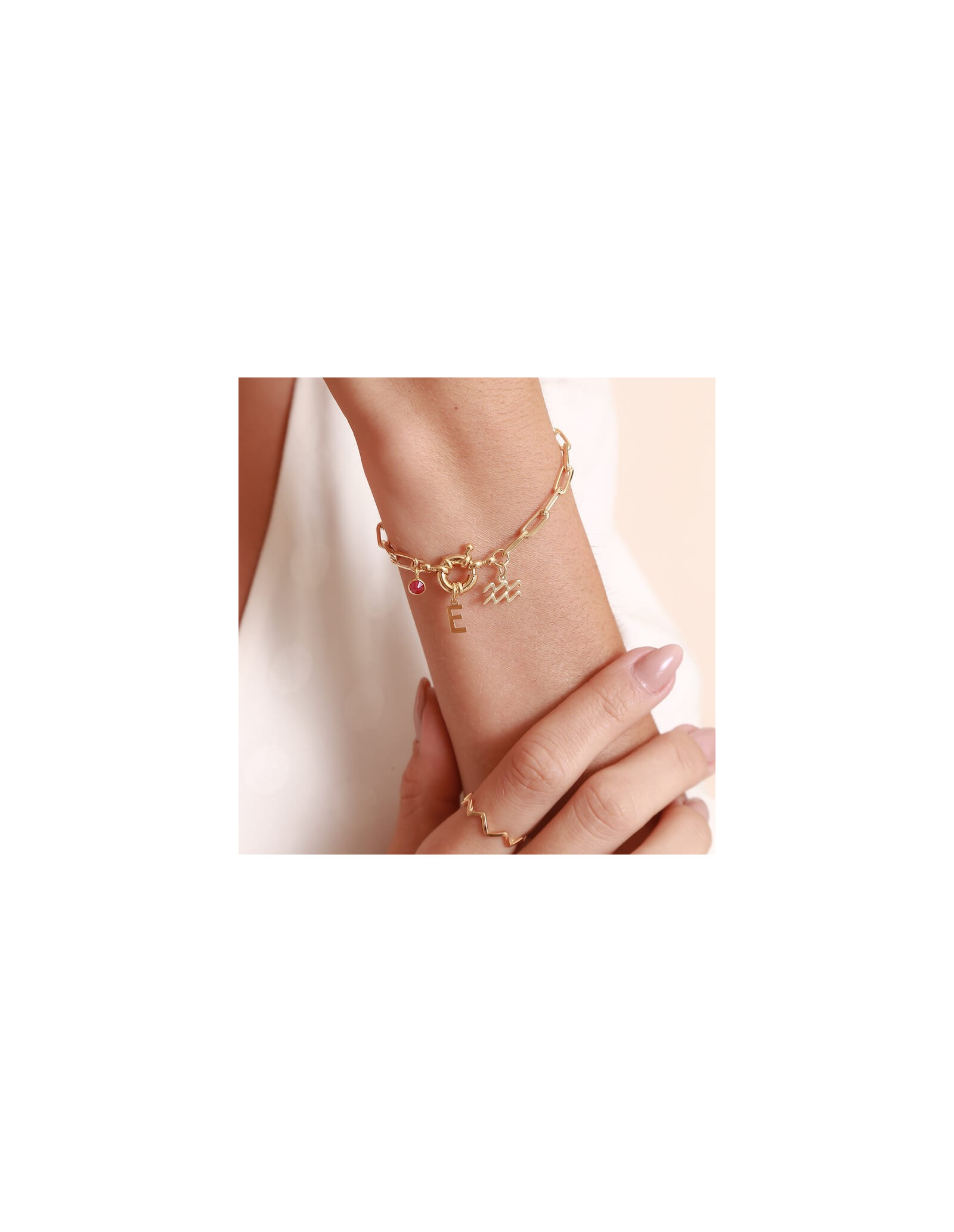 Pulsera de cadena con cierre marinera, decorada con una inicial, un símbolo del zodiaco y un mineral.