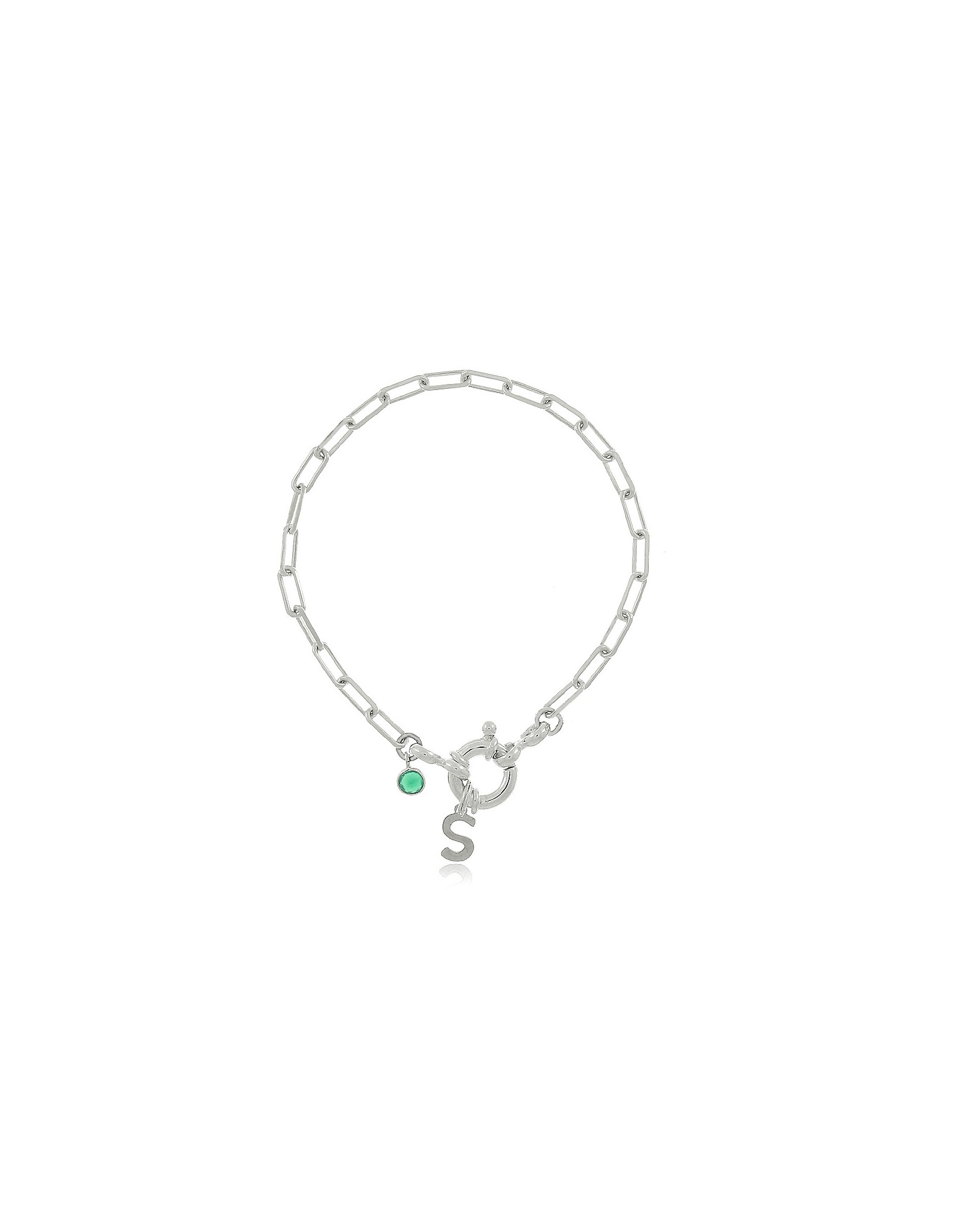 Pulsera personalizada en plata 925 con inicial y mineral, cadena de eslabones alargados y cierre marinera.
