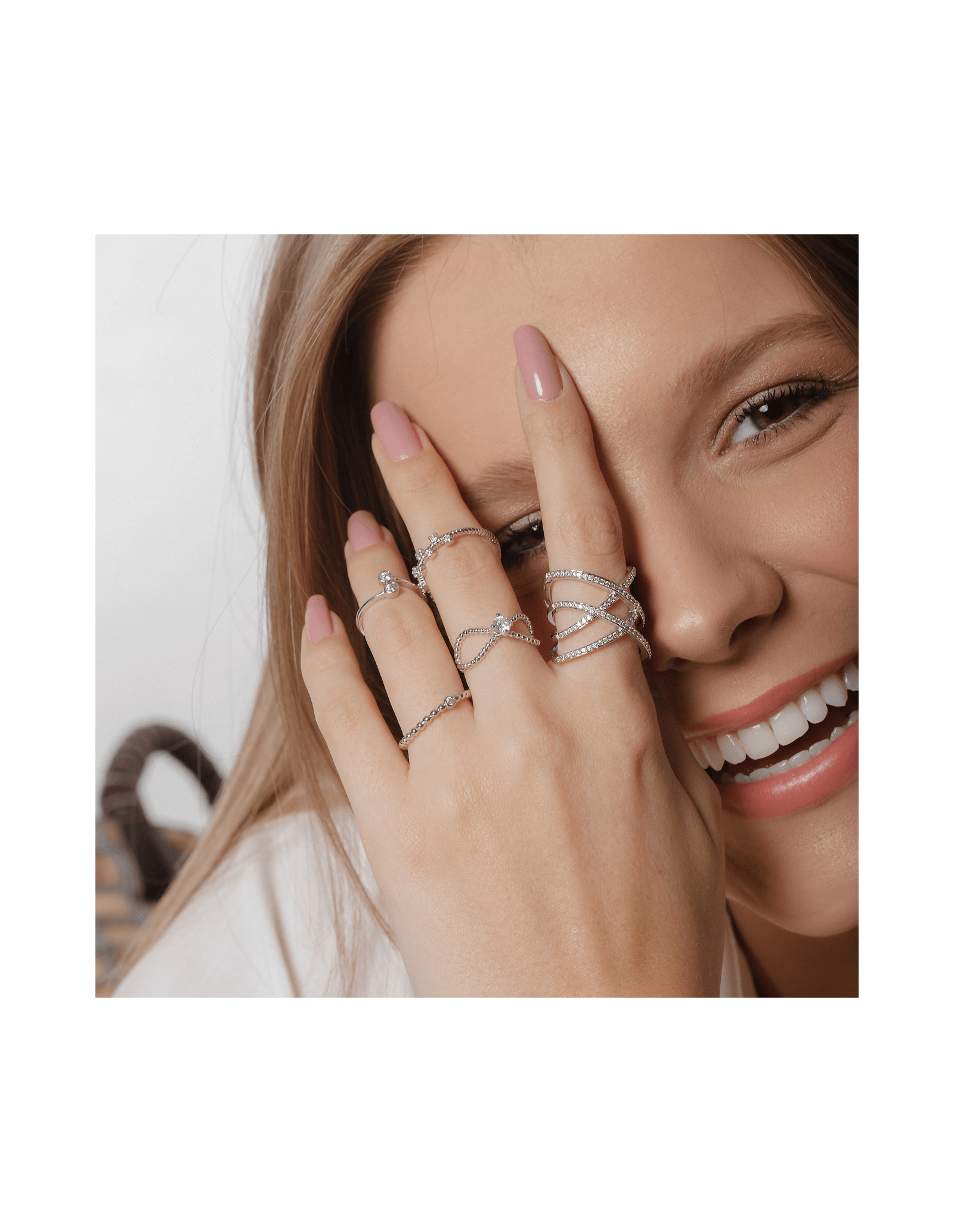 Anel maxi com cuatro tiras decoradas com zirconias transparentes. A peça perfeita para dar um toque de sofisticação ao seu look.