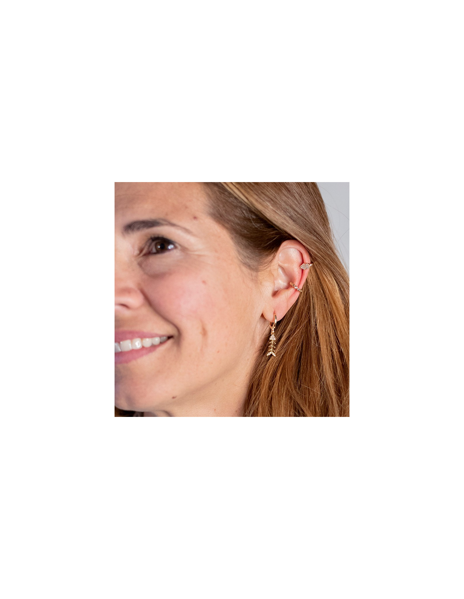 Brincos mini de argola com fecho articulado e pingente de espinha de peixe com zirconias brancas.