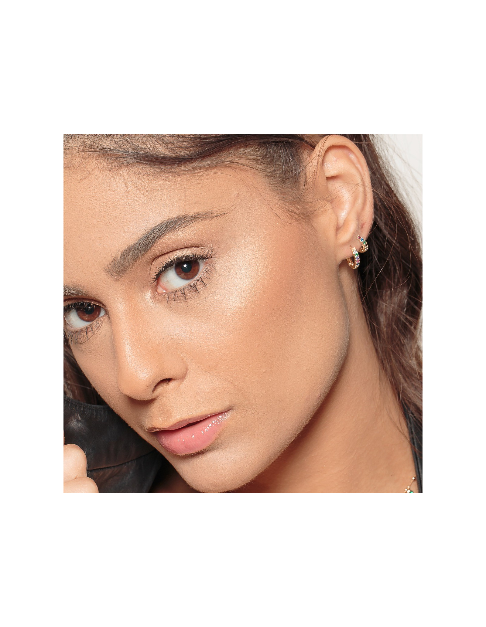 Mini argola articulada, para o primeiro, segundo ou terceiro furos, banhada em oro 18k com zirconias multi coloridos.