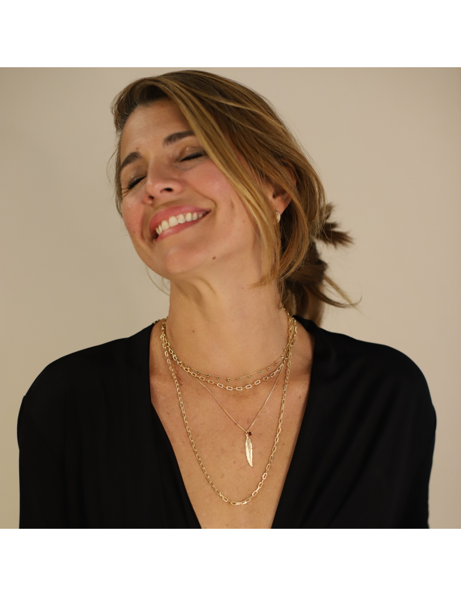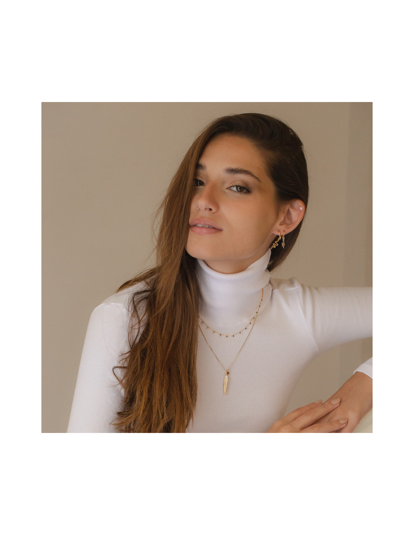 Colar curto folheado a ouro 18K com pingentes de penas e círculo com pedra natural.