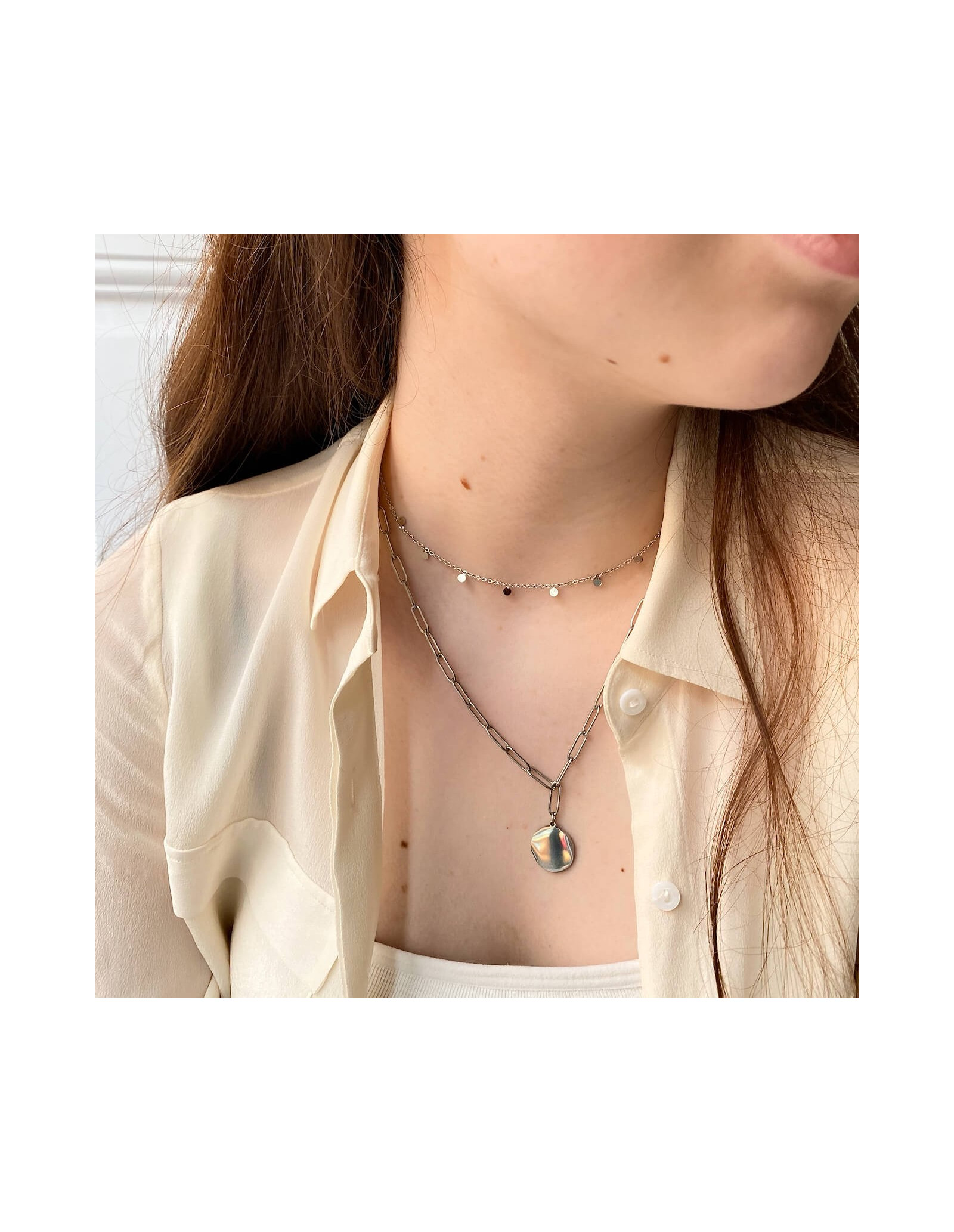 Colar curto de desenho minimalista, cadena con pingente de chapinha redonda, em aço inoxidável cirúrgico.