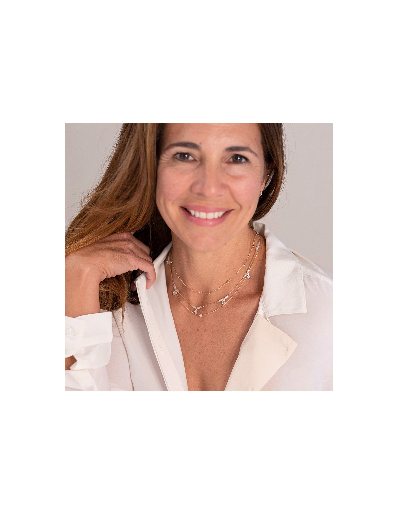 Colar curto de corrente tipo veneziana com pérolas e zircônias.
