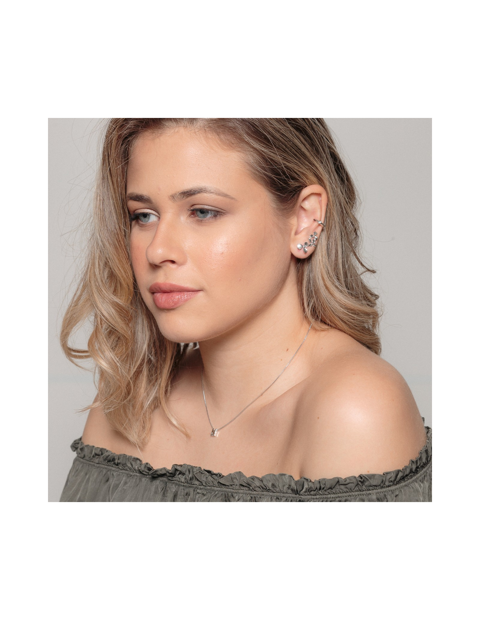 Combinação de colar com pendente inicial e ear cuffs com motivo floral.